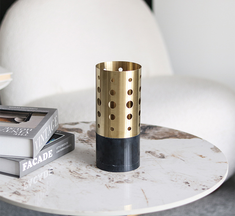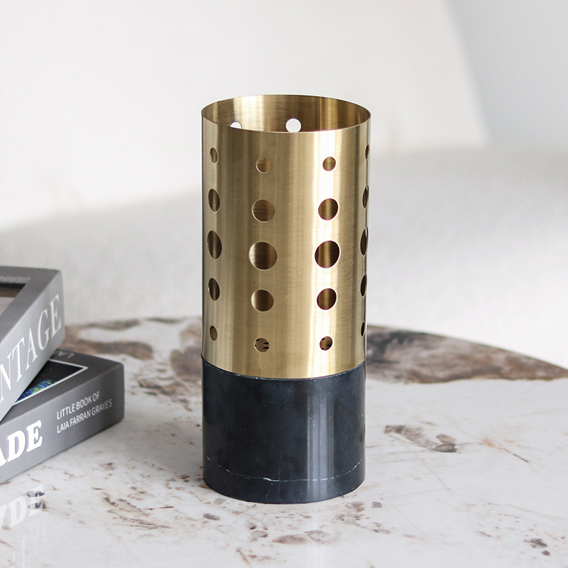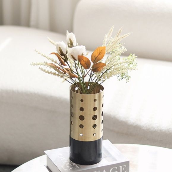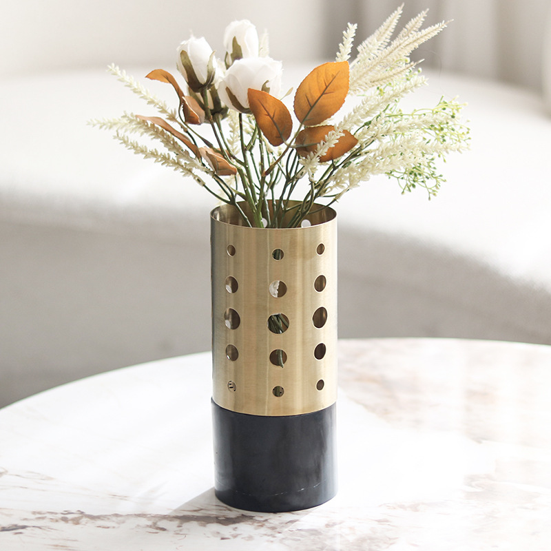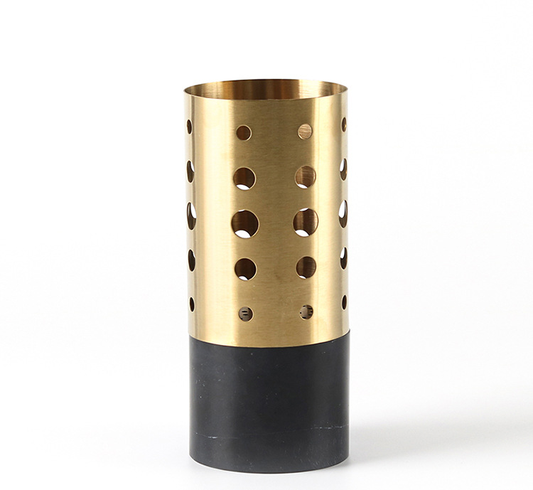 丸い穴が規則的に配置された金属製の円筒形花器です。