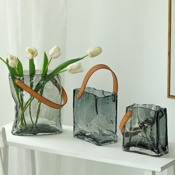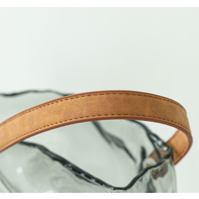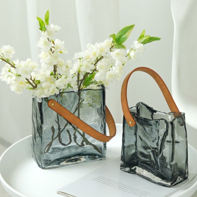 透明感のあるガラスに革製の持ち手が組み合わさり、機能性と装飾性を両立したインテリア雑貨として空間に華やかさをもたらします。
