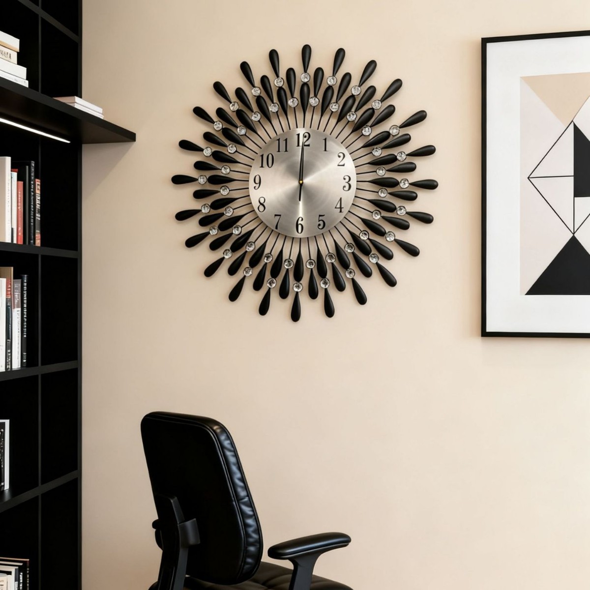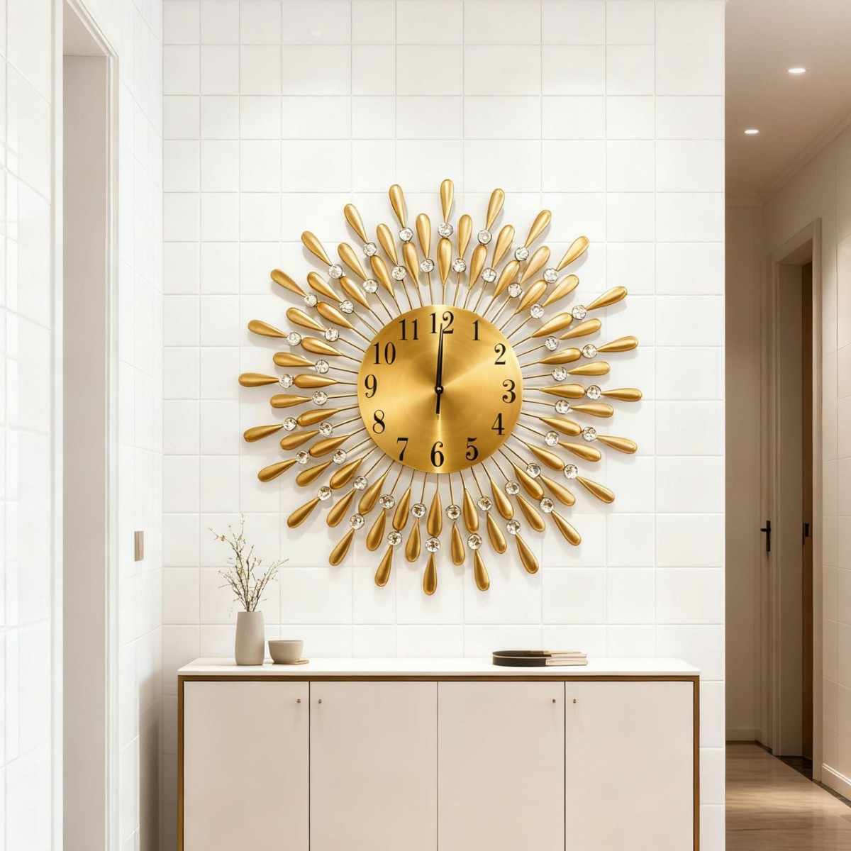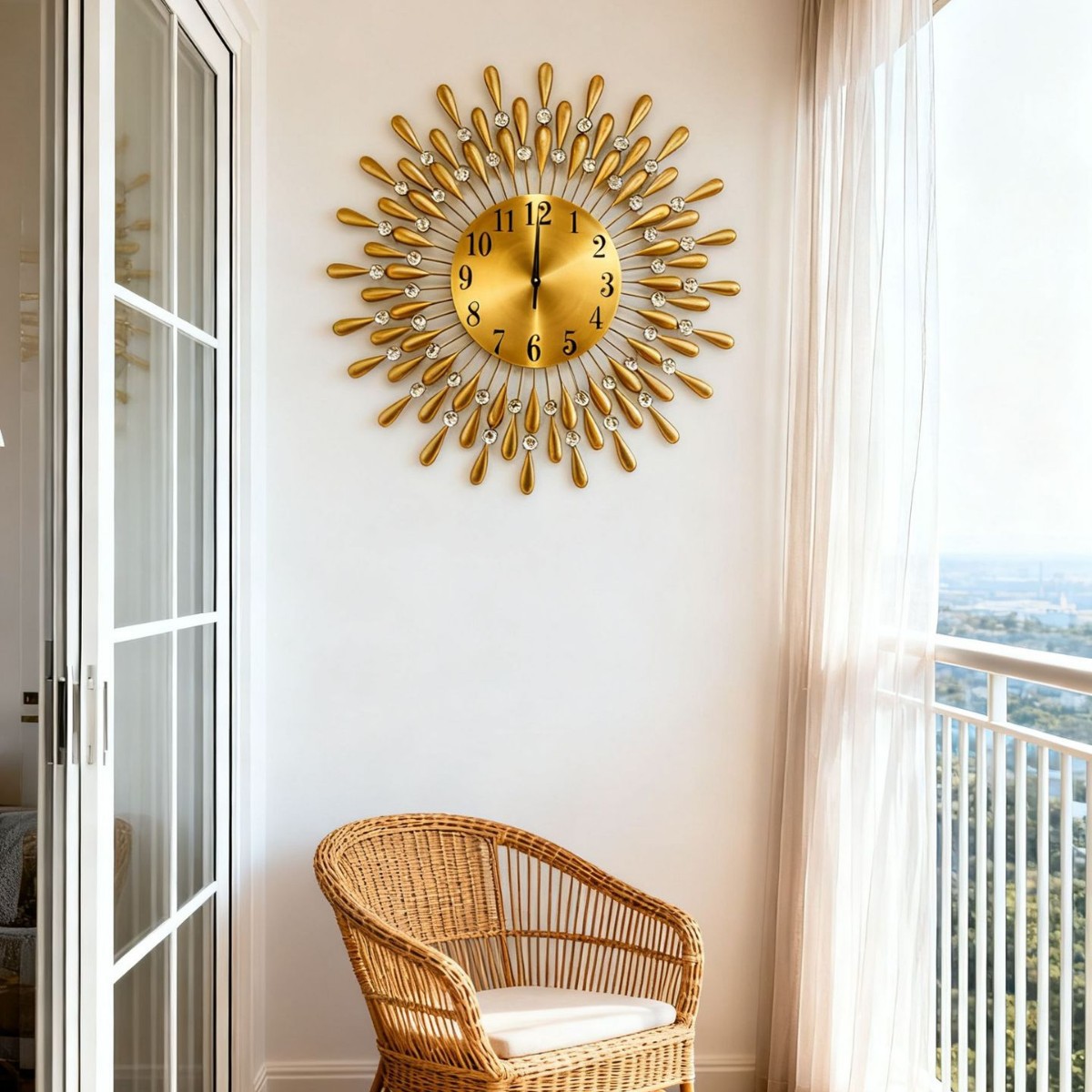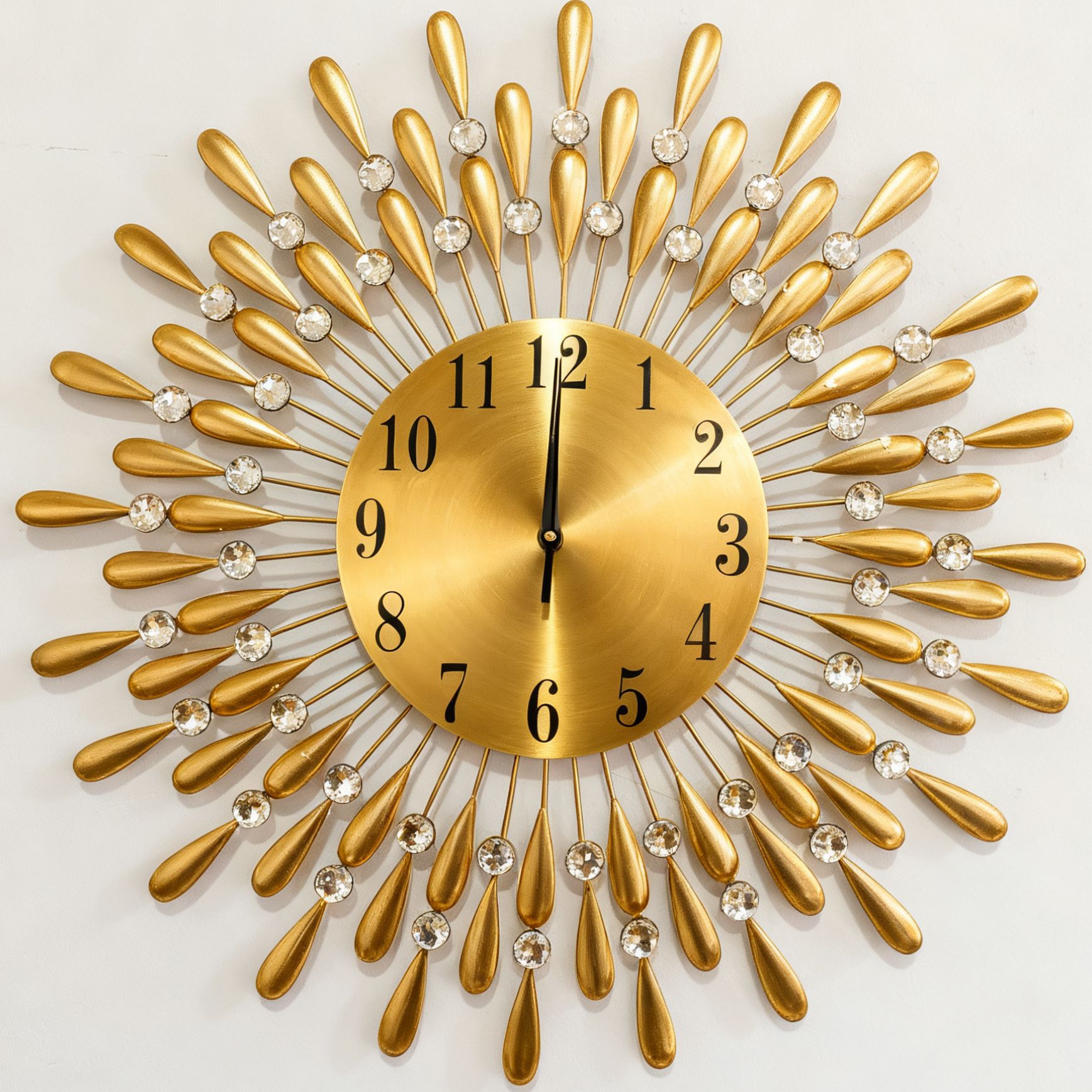 太陽の光を連想させる放射状のデザインが美しい壁掛け時計です。